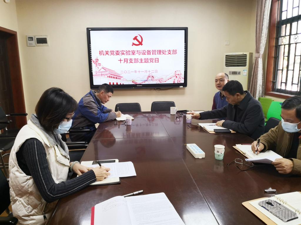 11月12日上午10:00,实验室与设备管理处党支部在行政楼附楼208会议室召开10月份支部主题党日学习活动。会议由支部书记贺占魁主持,支部全体在职党员参会,校党委常委、副校长李鸿飞参与了学习。