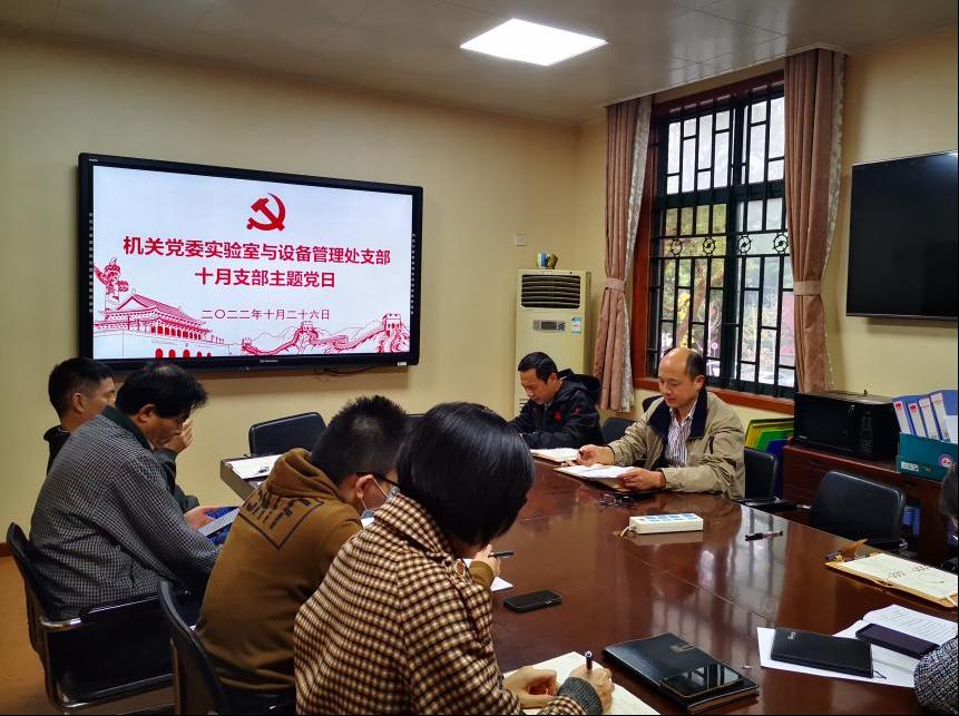 10月26日下午3:30,实验室与设备管理处党支部在行政楼附楼208会议室召开2022年10月份支部主题党日活动。会议由支部书记贺占魁同志主持。