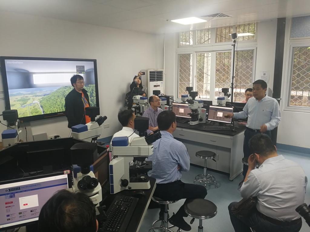 来访专家们首先参观了国家数字化学习工程技术研究中心,了解我校在促进教育信息化技术和产品的标准化,提升教育信息化领域的技术创新能力及科技成果工程化研究和产业化转化水平方面取得的成果。随后在生物学国家级虚拟仿真实验教学中心,李兵向来访专家们介绍了中心在生物学虚拟仿真实验教学方面的探索和实践,以及构建的“虚实结合,以虚促实”、具有自主特色的虚拟仿真实验教学项目体系,并现场演示了获批国家虚拟仿真实验项目的“放射性同位素标记的核酸分子杂交”、“珍稀动物生物学习性观察研究”等虚拟仿真实验项目。来访专家们对我校在高水平科研实验室建设和虚拟仿真实验教学改革等方面取得的突出成绩表示赞赏,并希望今后进一步加强交流互访。