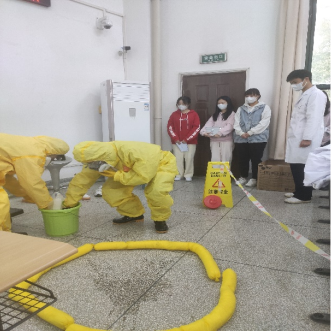 实验室危废培训的内容涵盖了实验室危废基本情况,相关政策法规,规范处置流程等板块。危废处置演练由化学学院多名研究生志愿者在指导下配合完成,模拟了实验室废液在转运过程中发生倾倒泄露事故的情景,技术人员配合演练进行讲解,系统地介绍了废液泄漏后的应急处理流程。