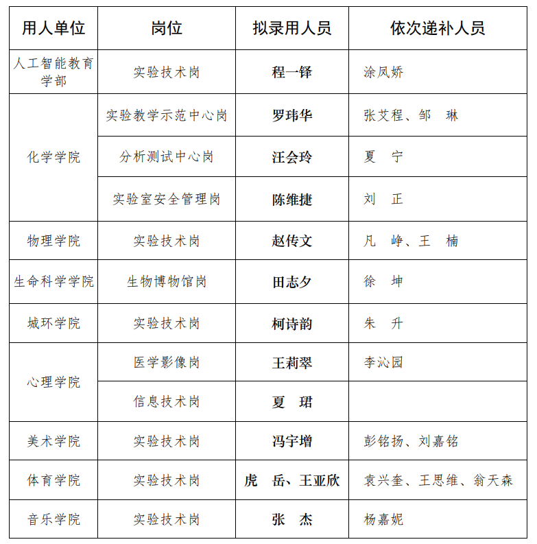 根据华中师范大学2023年实验技术人员招聘工作方案,经个人报名、资格审查、学院考核和学校考核等环节,现将拟录用人员及递补人员公示如下: