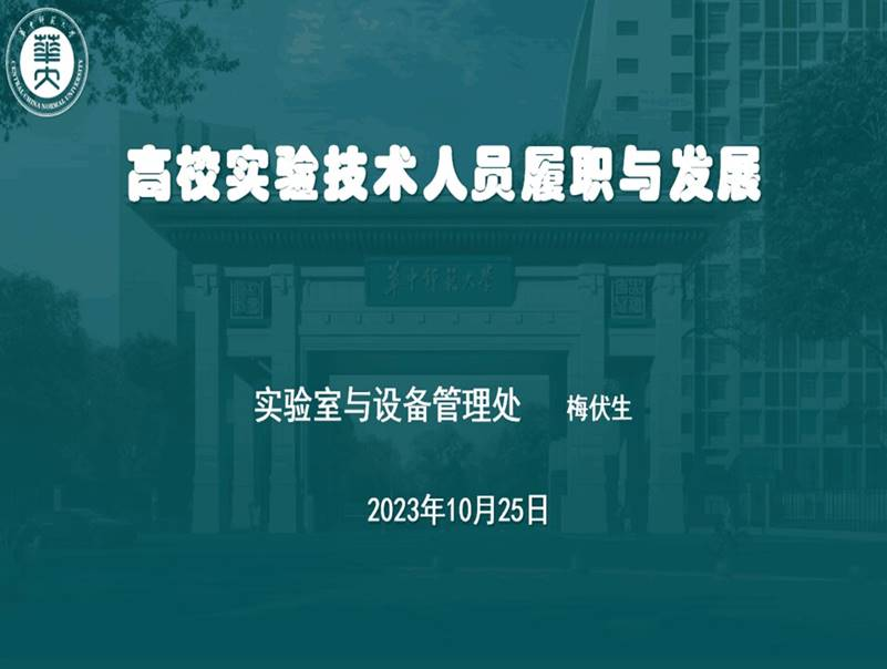 为加强我校实验技术队伍建设,促进履职与发展相结合,学校于2023年10月25日,组织召开了学校第78期“实验室科学管理•技术创新”暨“现身说法话履职(第9期)”培训会,由实验室与设备管理处副处长梅伏生研究员以“高校实验技术人员履职与发展”为题,为学校实验技术人员授课并答疑解惑。